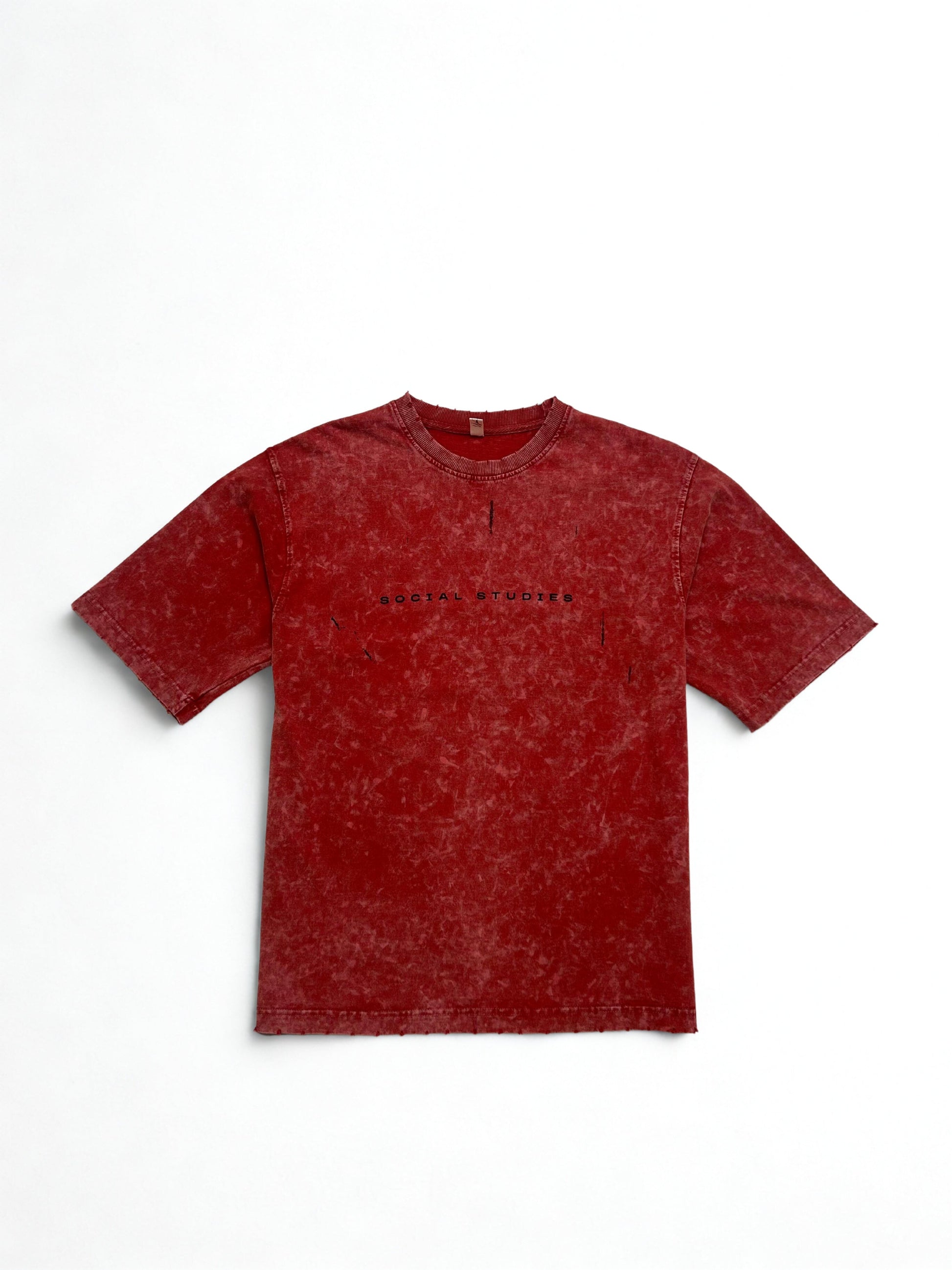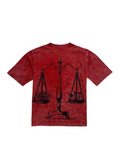 Red stone-washed and straight to the point. This tee’s got a Social Studies text on the chest and a full-scale graphic on the back — literally. The weighing scale artwork hits different with the line that started it all: All grams, no scams. Finished with distressing on the neck, sleeves, and hem for that rough, real-life feel.
