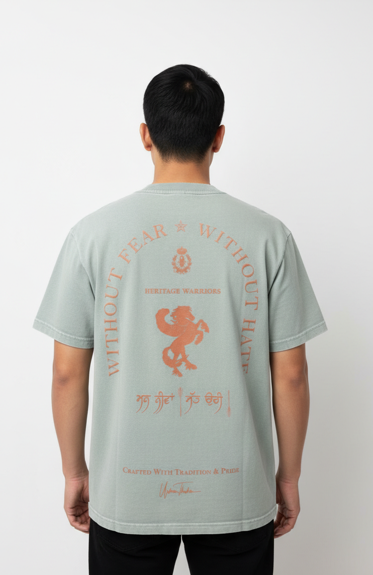 Featuring a vintage-inspired washed finish, the shirt carries a naturally faded look that adds character and depth. The chest showcases a subtle laurel emblem with “No Fear No Hate,” while the back highlights the full Heritage Warriorsartwork—symbolizing strength, unity, and pride. Each graphic is printed in a warm, earthy tone that complements the washed grey body.